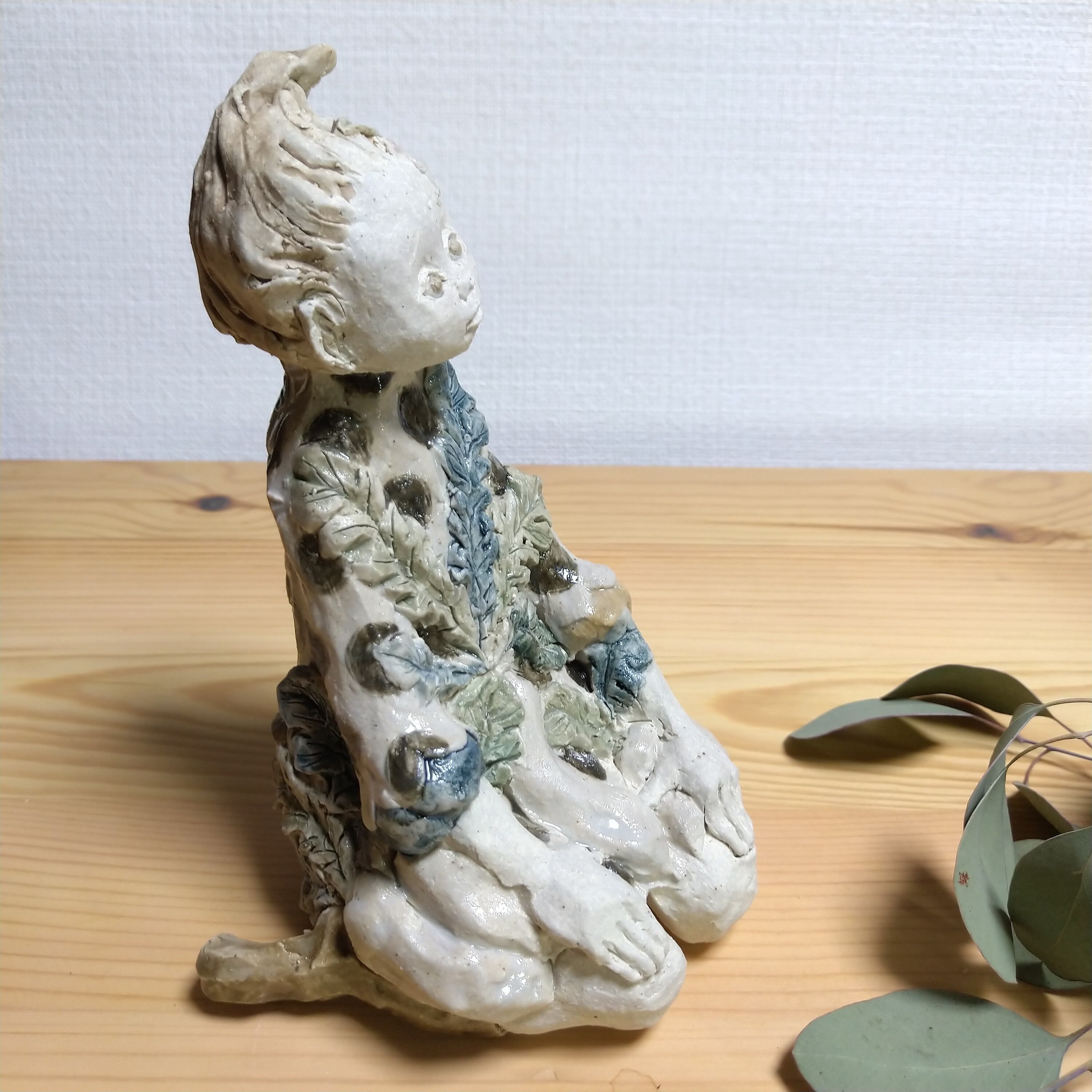 衣服の部分にはレリーフ技法を用いて、陶土での成形中に平面上に形態を盛り上げて起伏を与えたり、平面を彫り込んだりして、立体的な模様をデザインしています。
