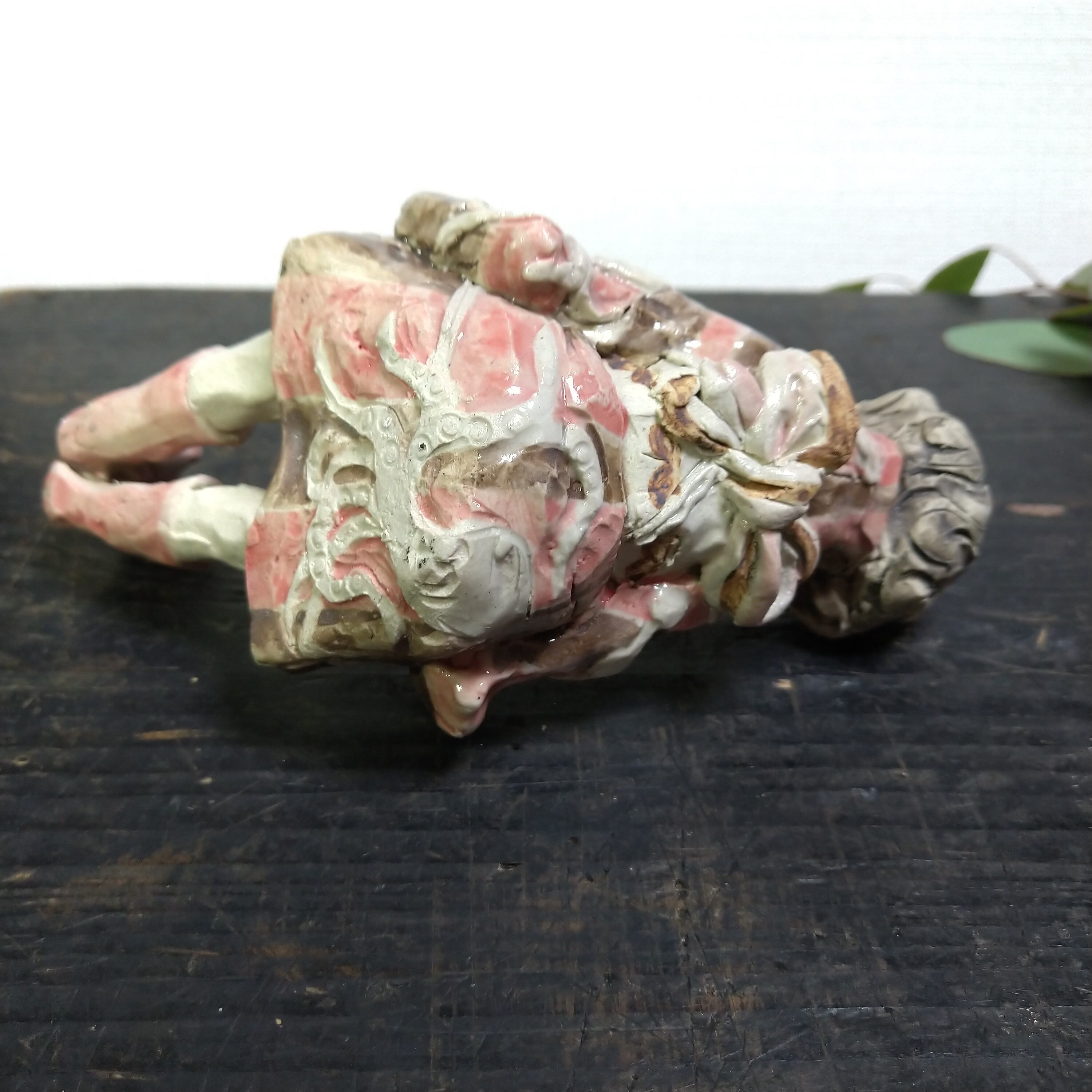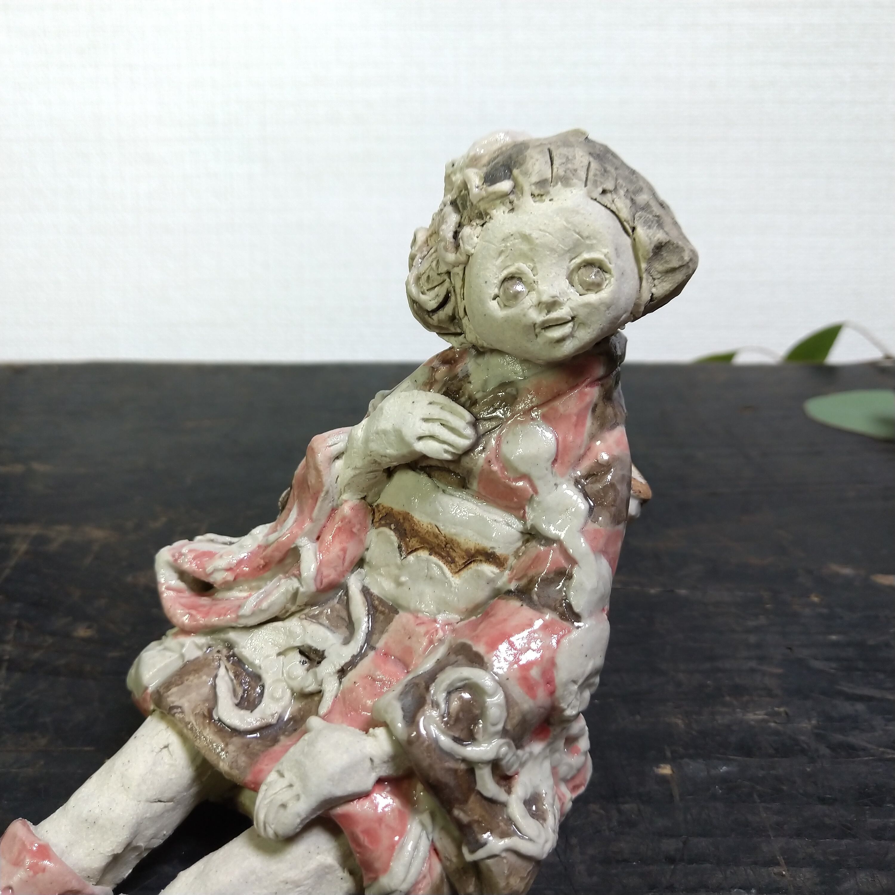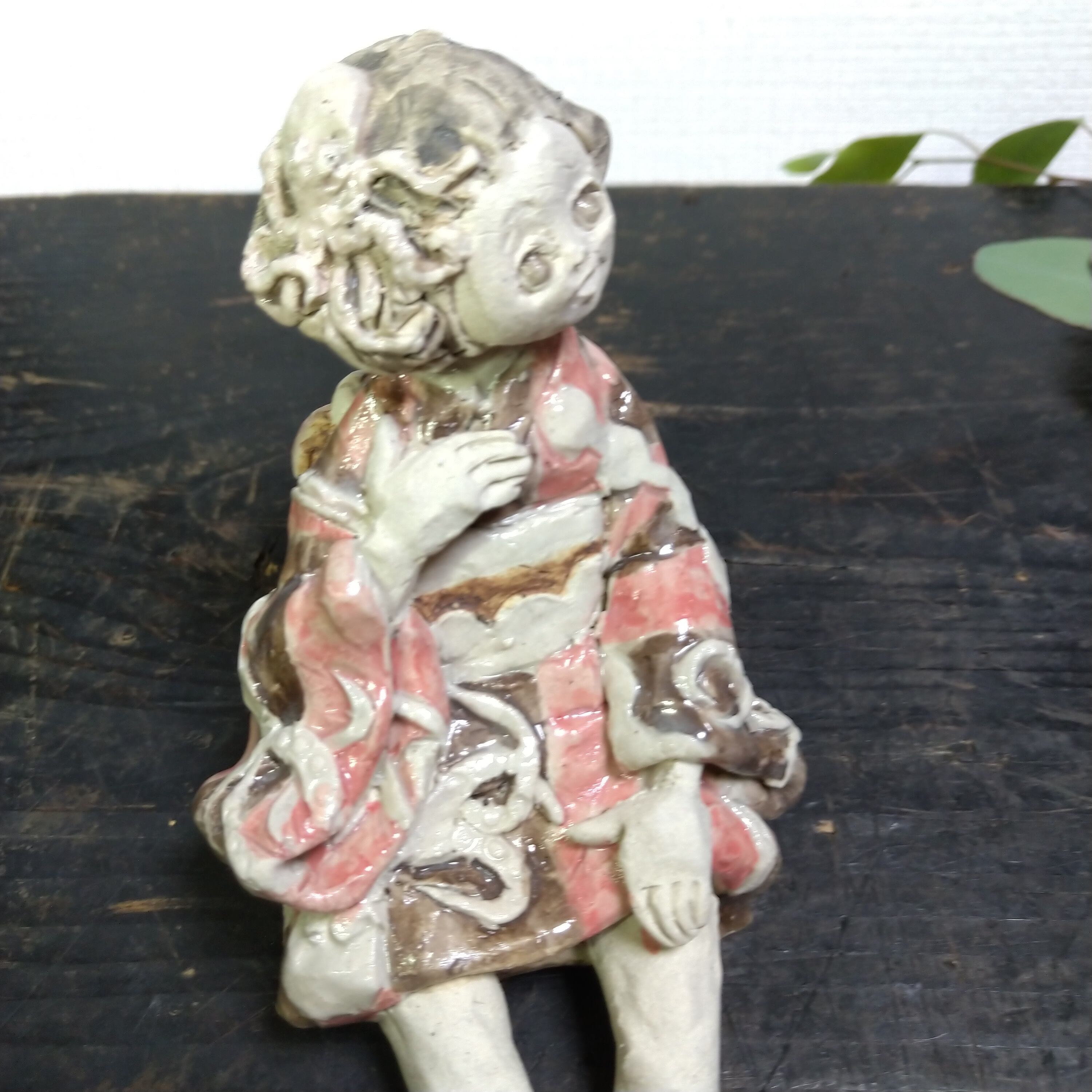 瞳や衣装の一部分にポイントで薄く透明釉をかけているので、その部分は少し光沢があります。