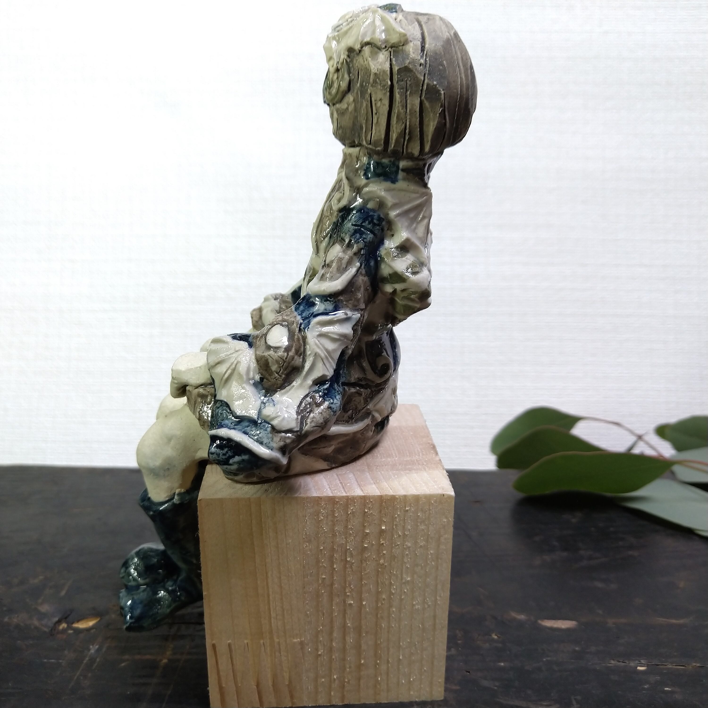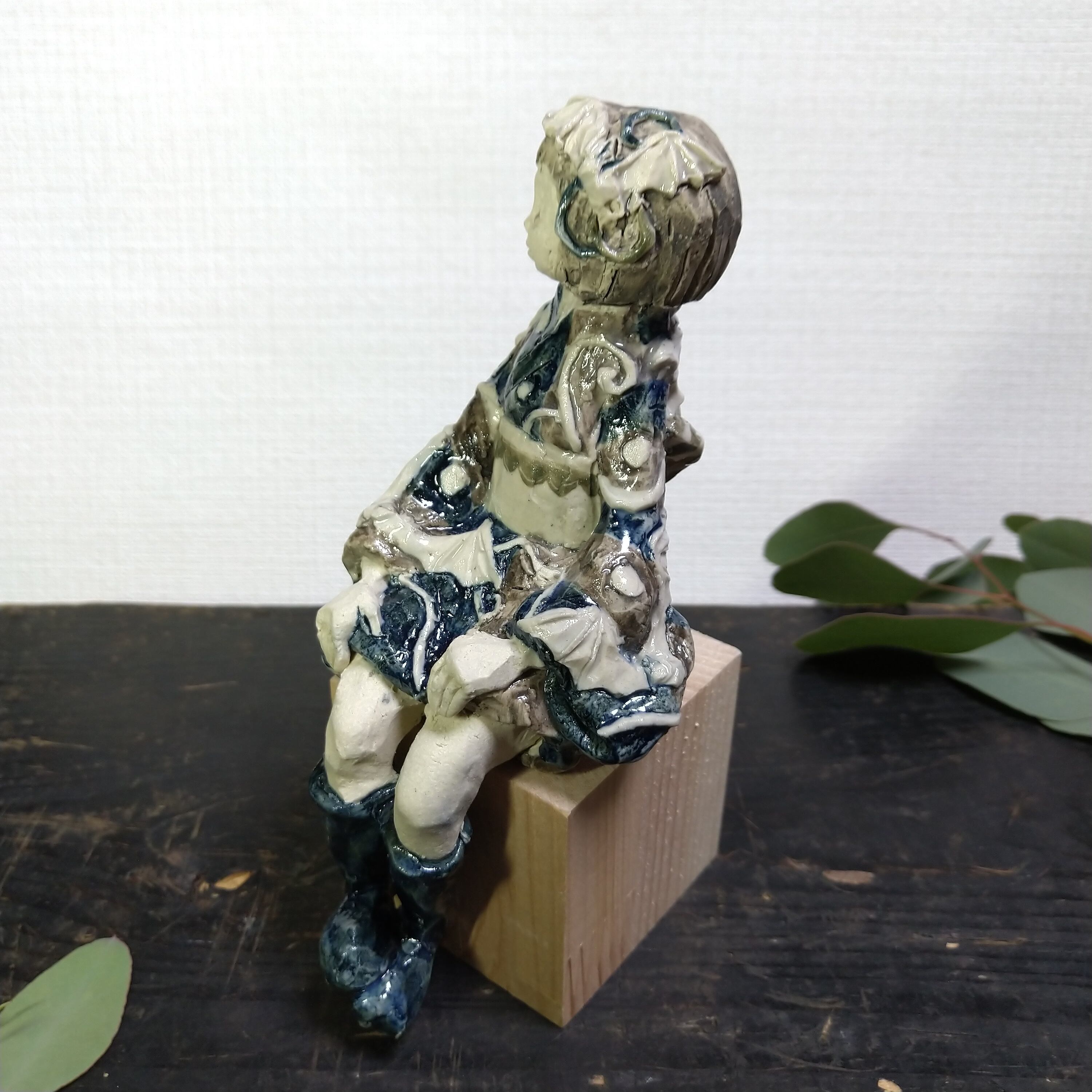 瞳や衣装の一部分にポイントで薄く透明釉をかけているので、その部分は少し光沢があります。