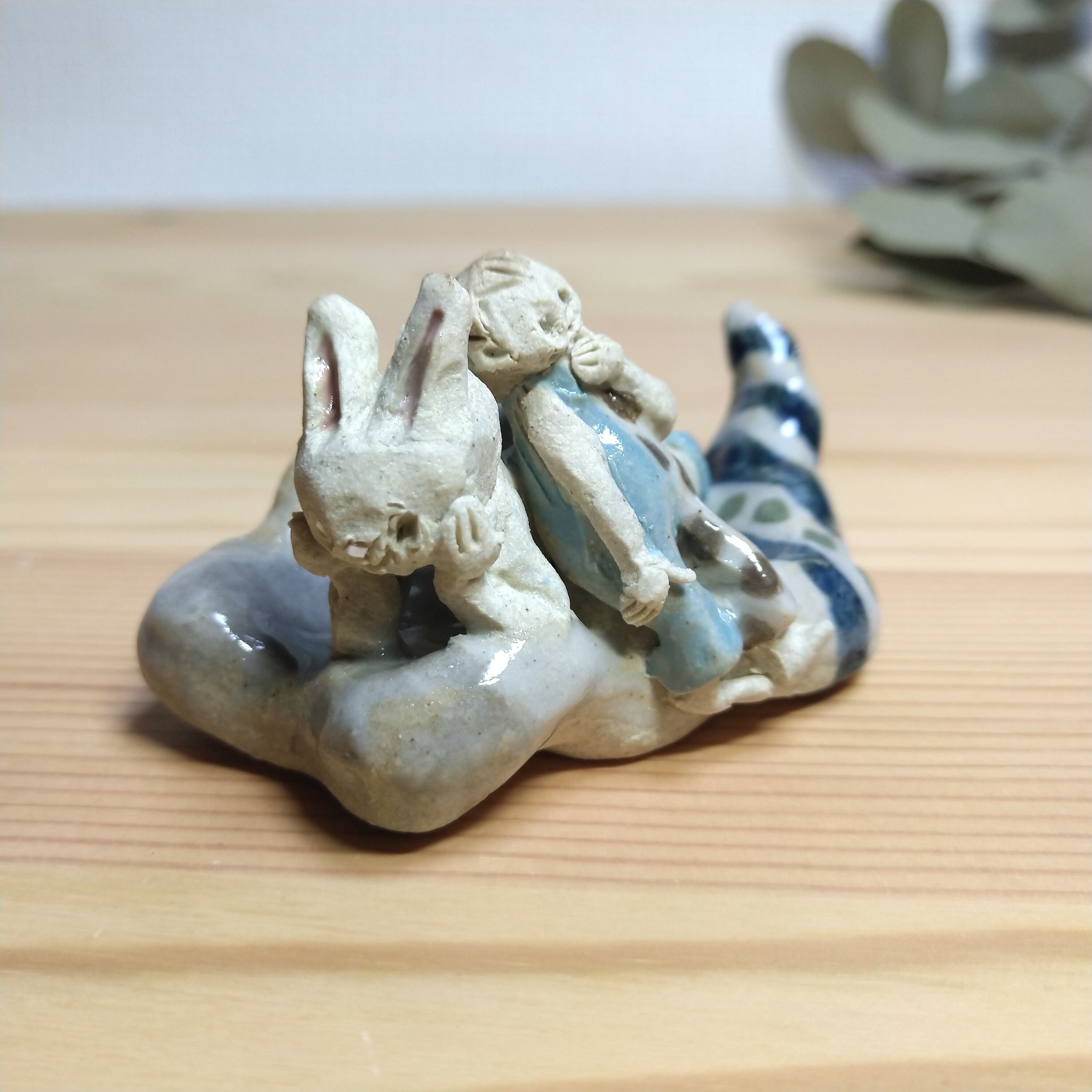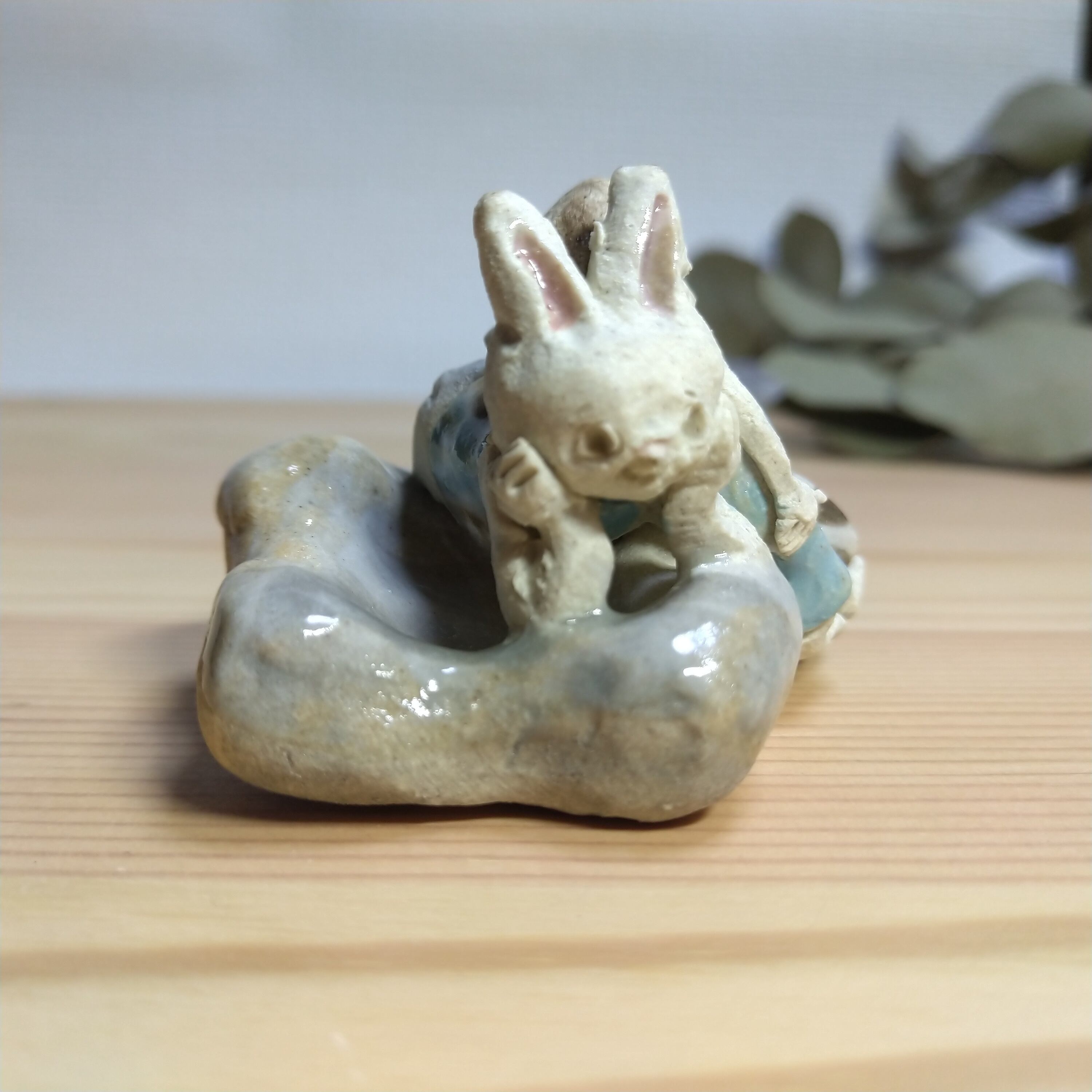 2023年の干支でもある、卯(うさぎ)さんとちびっこが雲型の土台に仲良くくつろいでいます。
