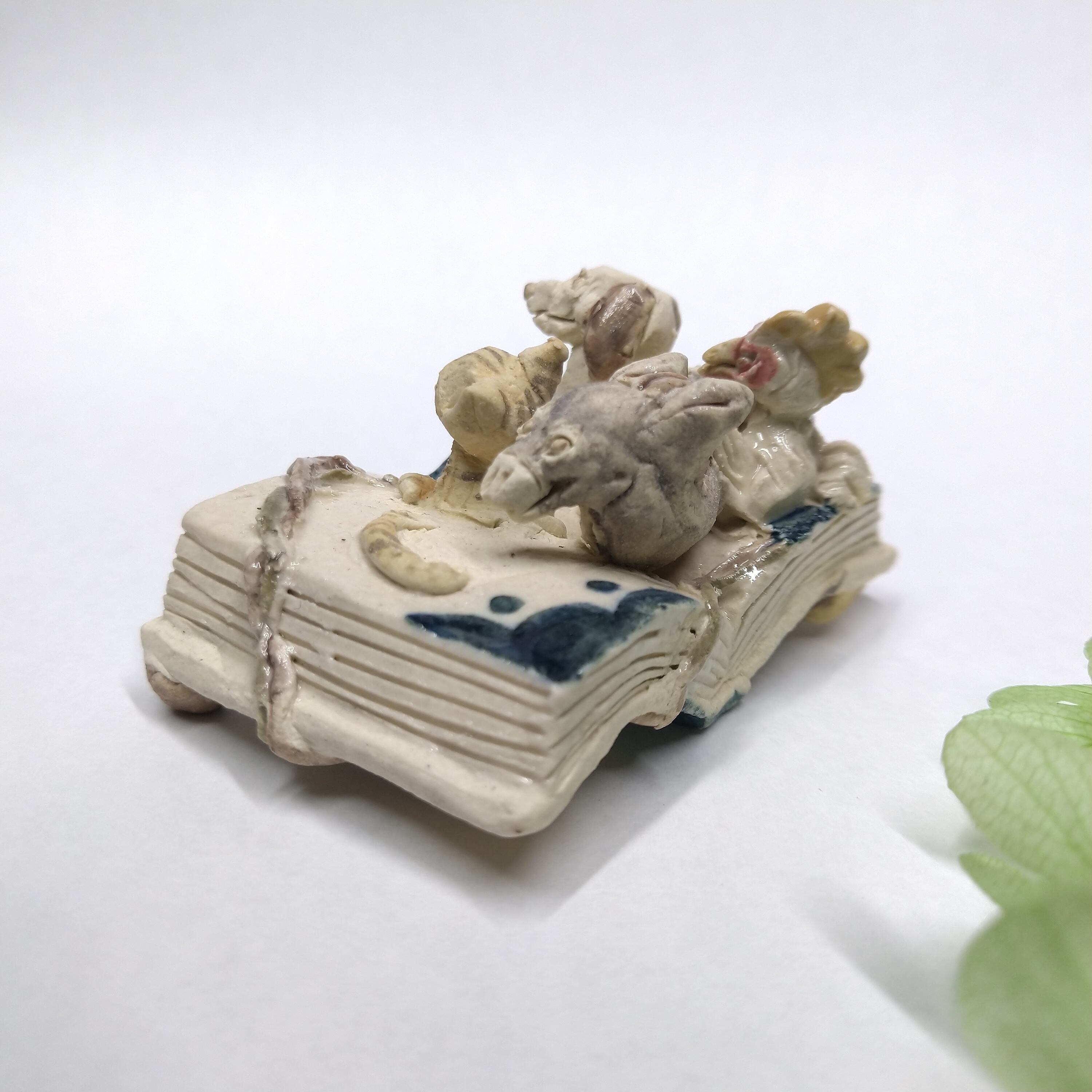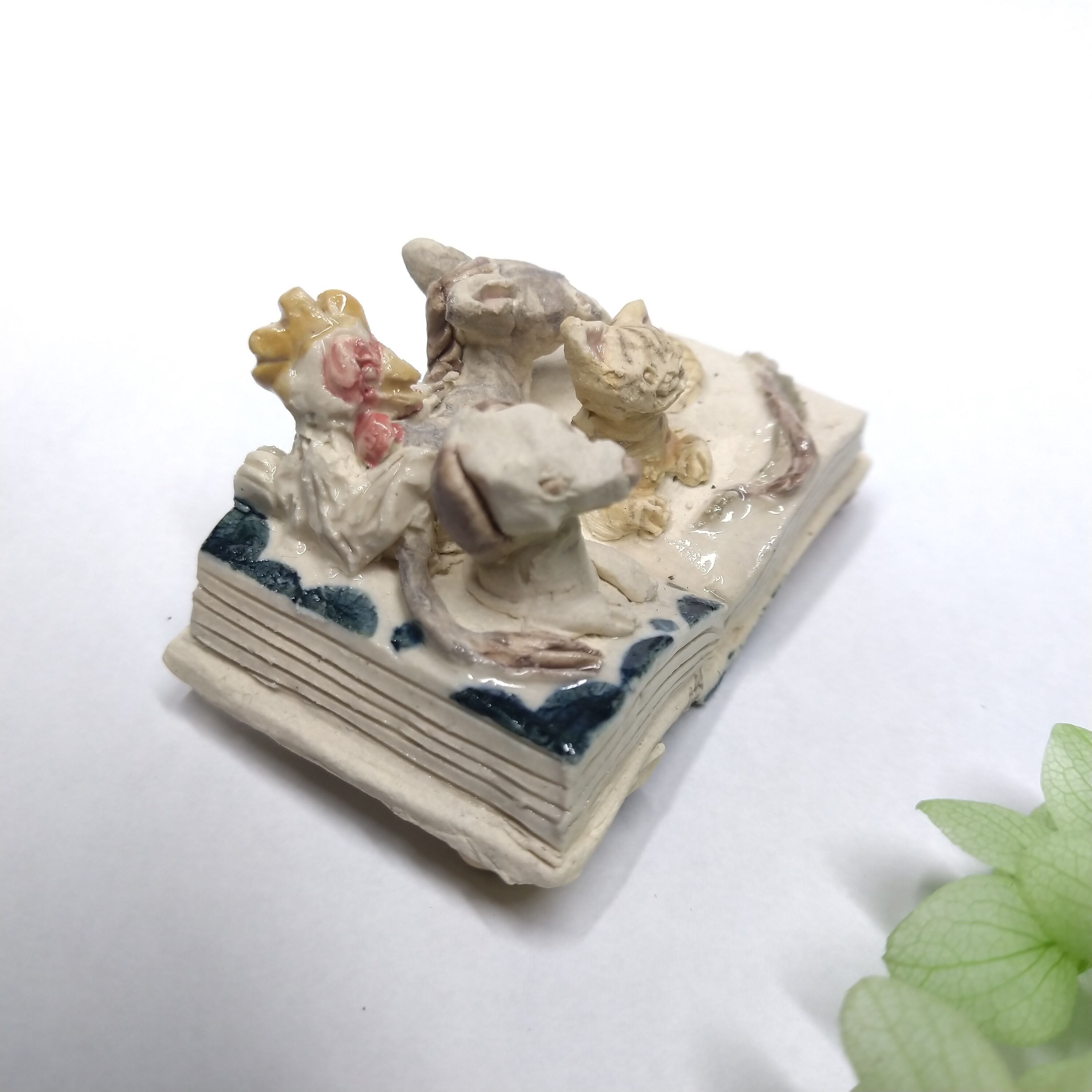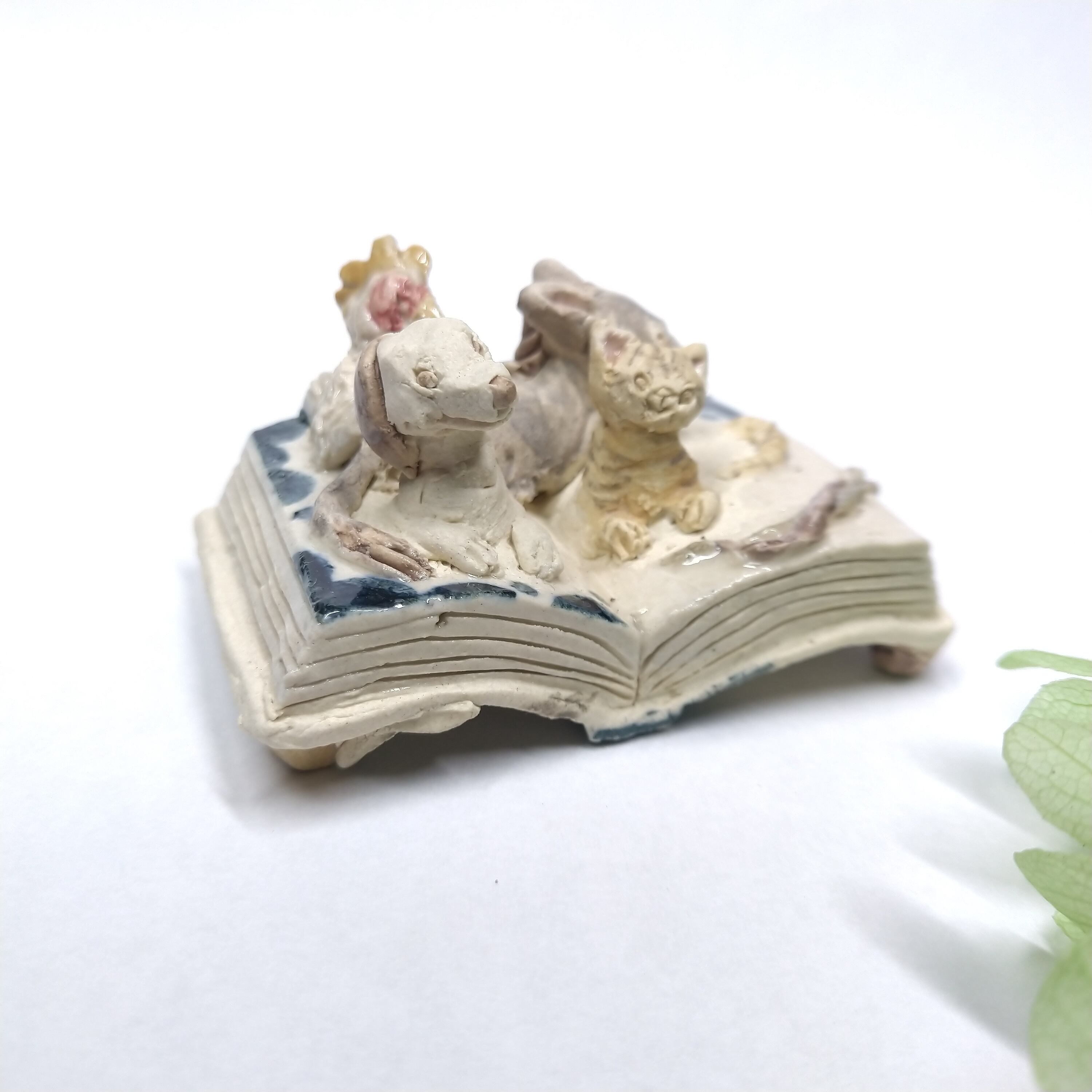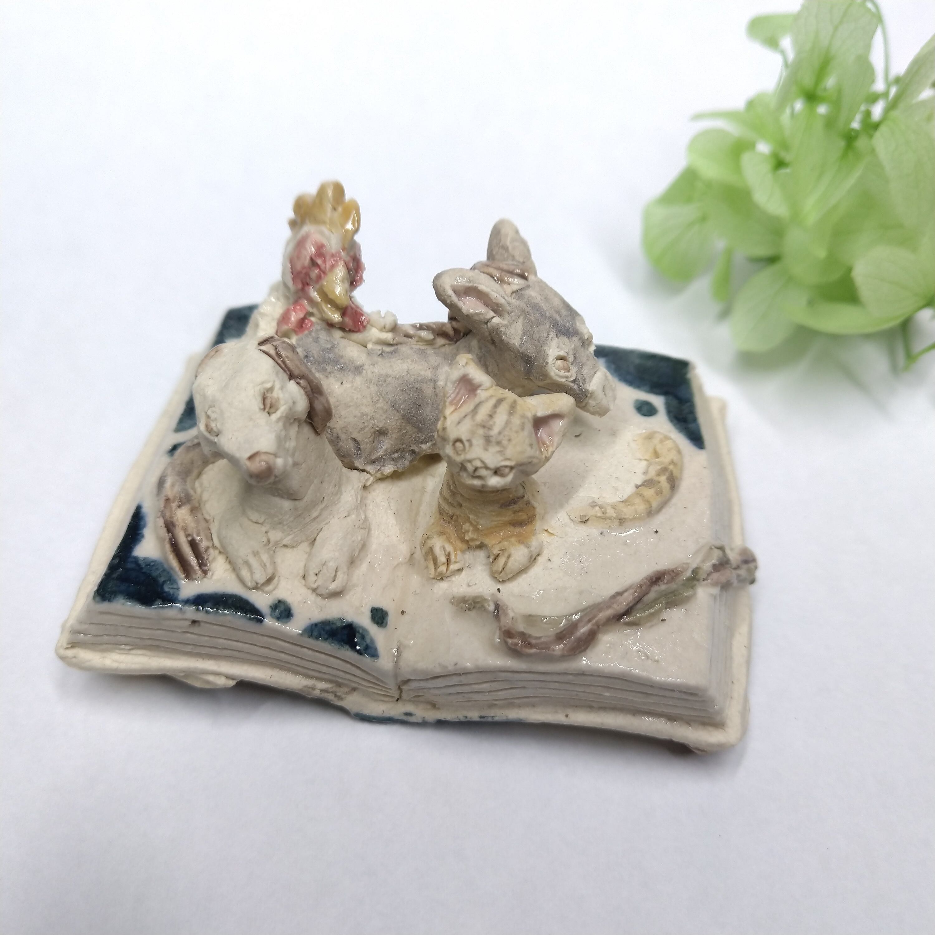 本や動物たちの一部に薄く透明釉を施しているので、その部分は少し光沢があります。