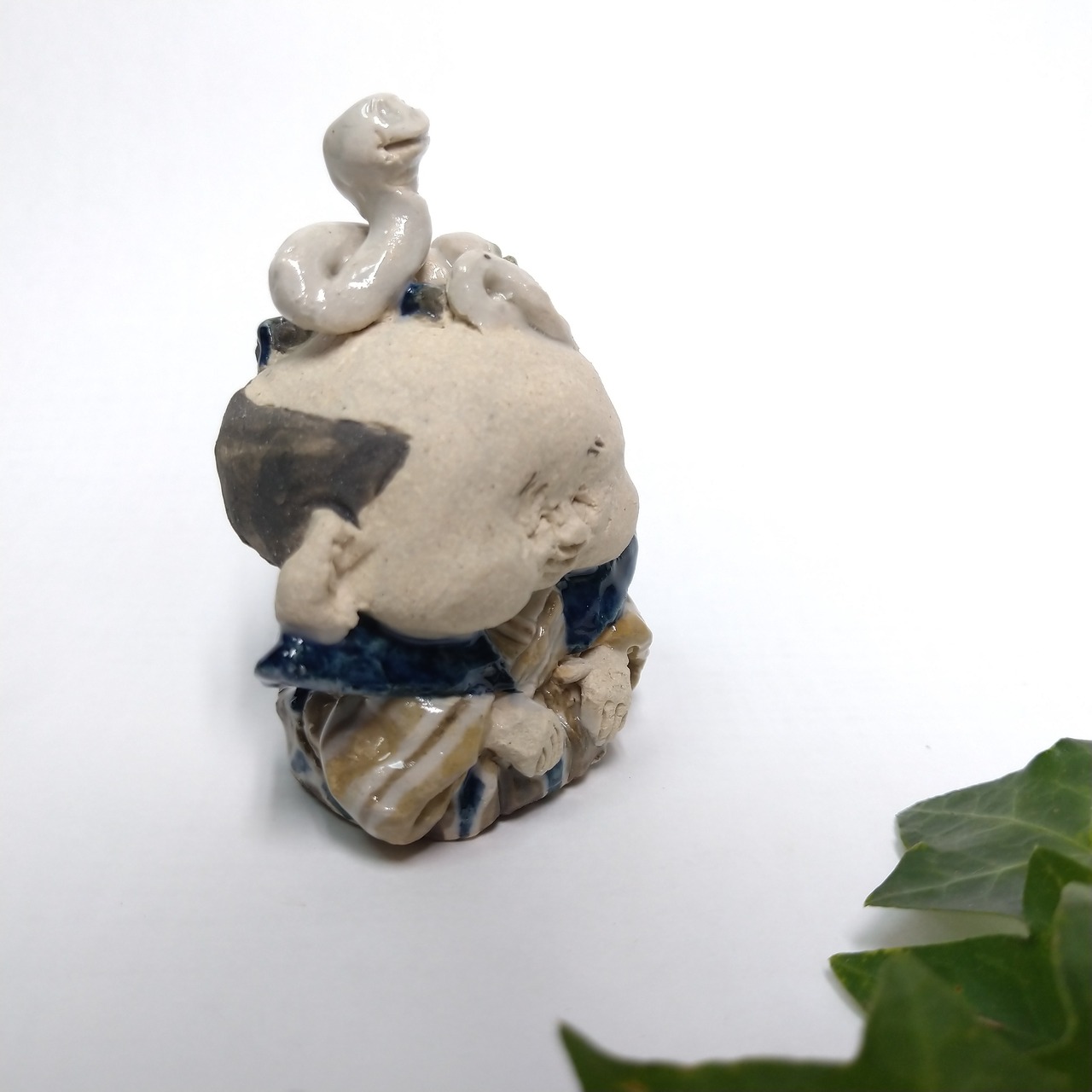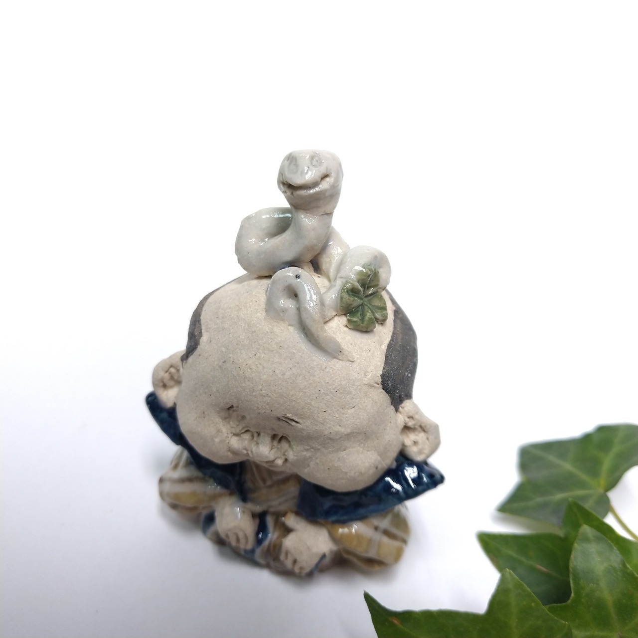 ヘビと四つ葉、衣装の一部に薄く透明釉を施しているので、その部分は少し光沢があります。