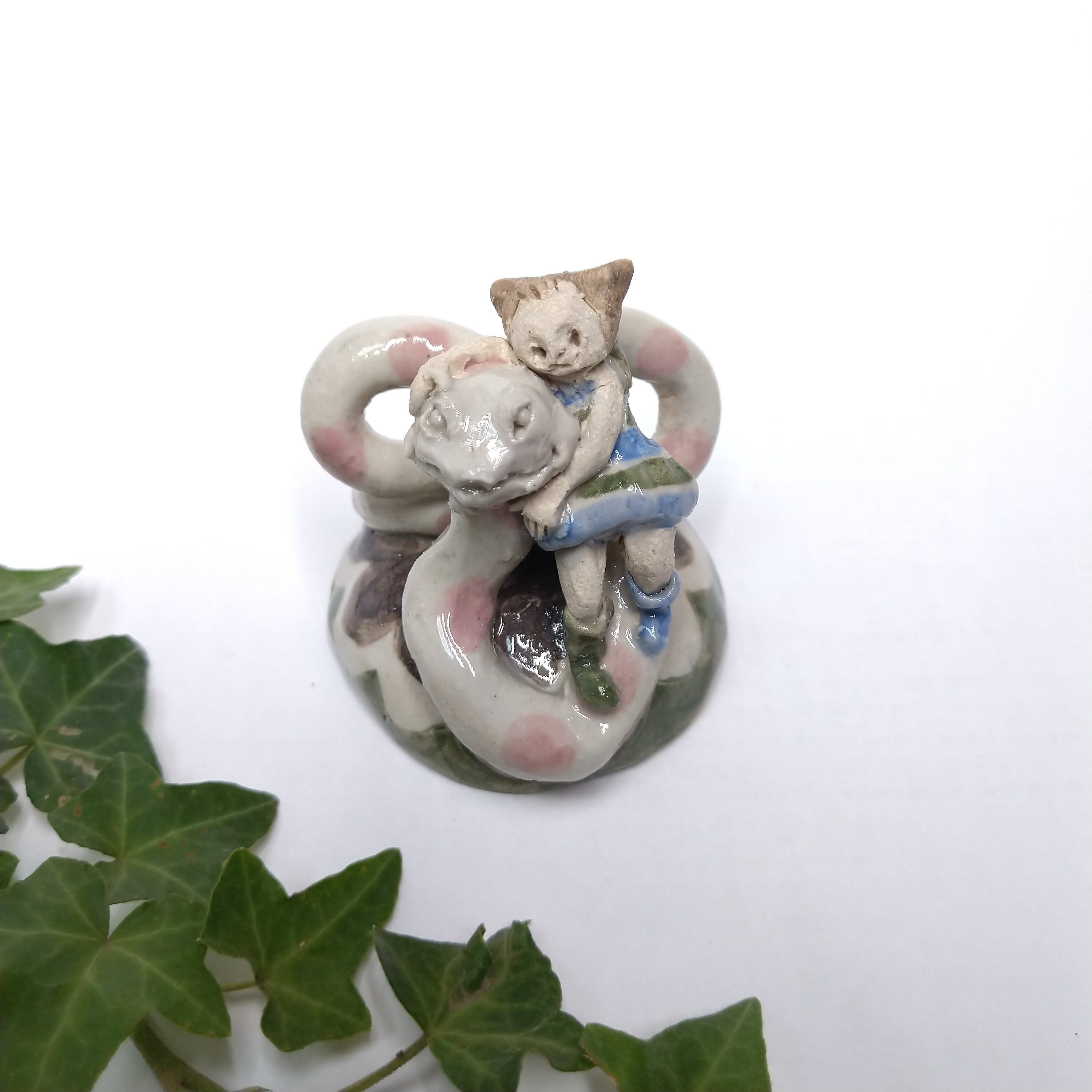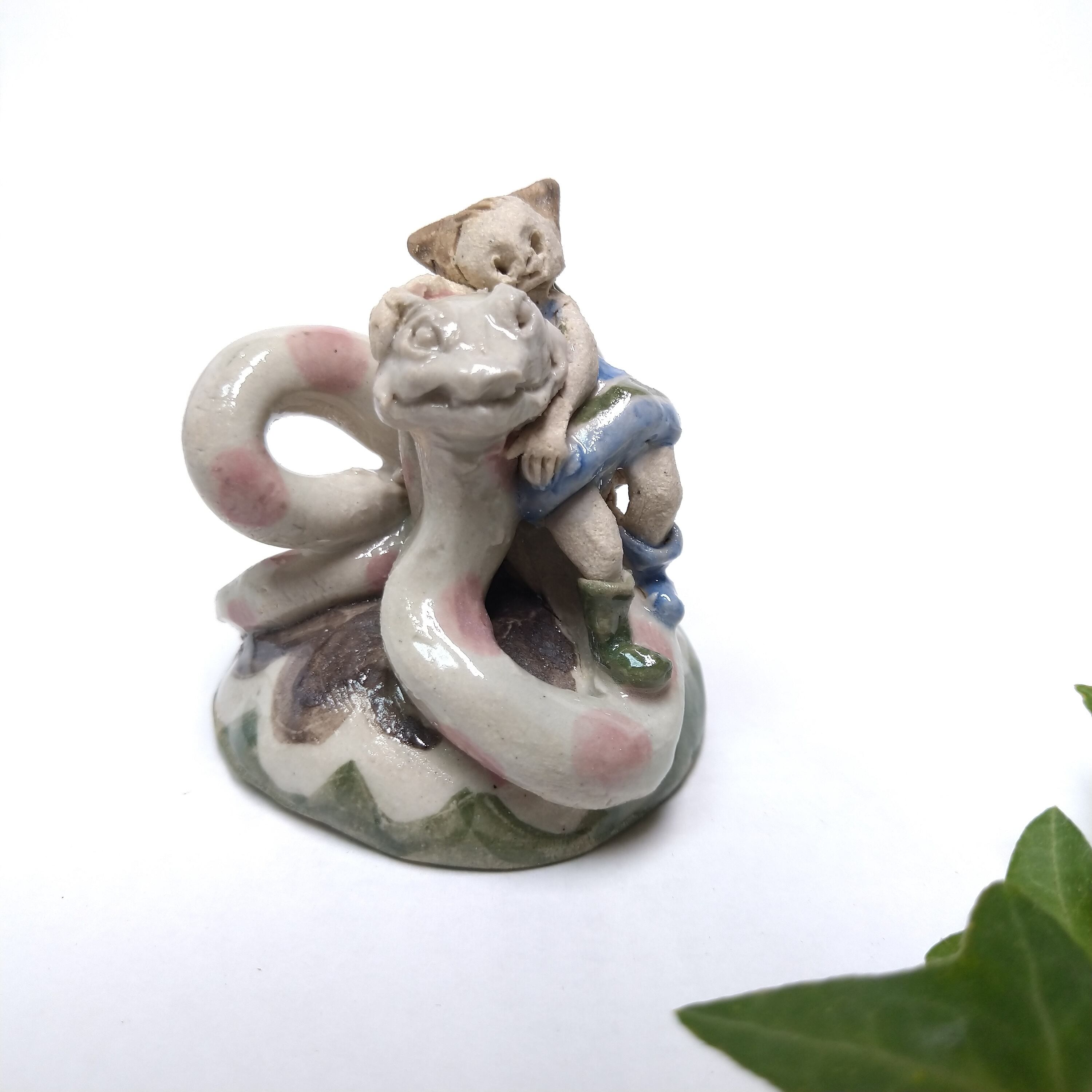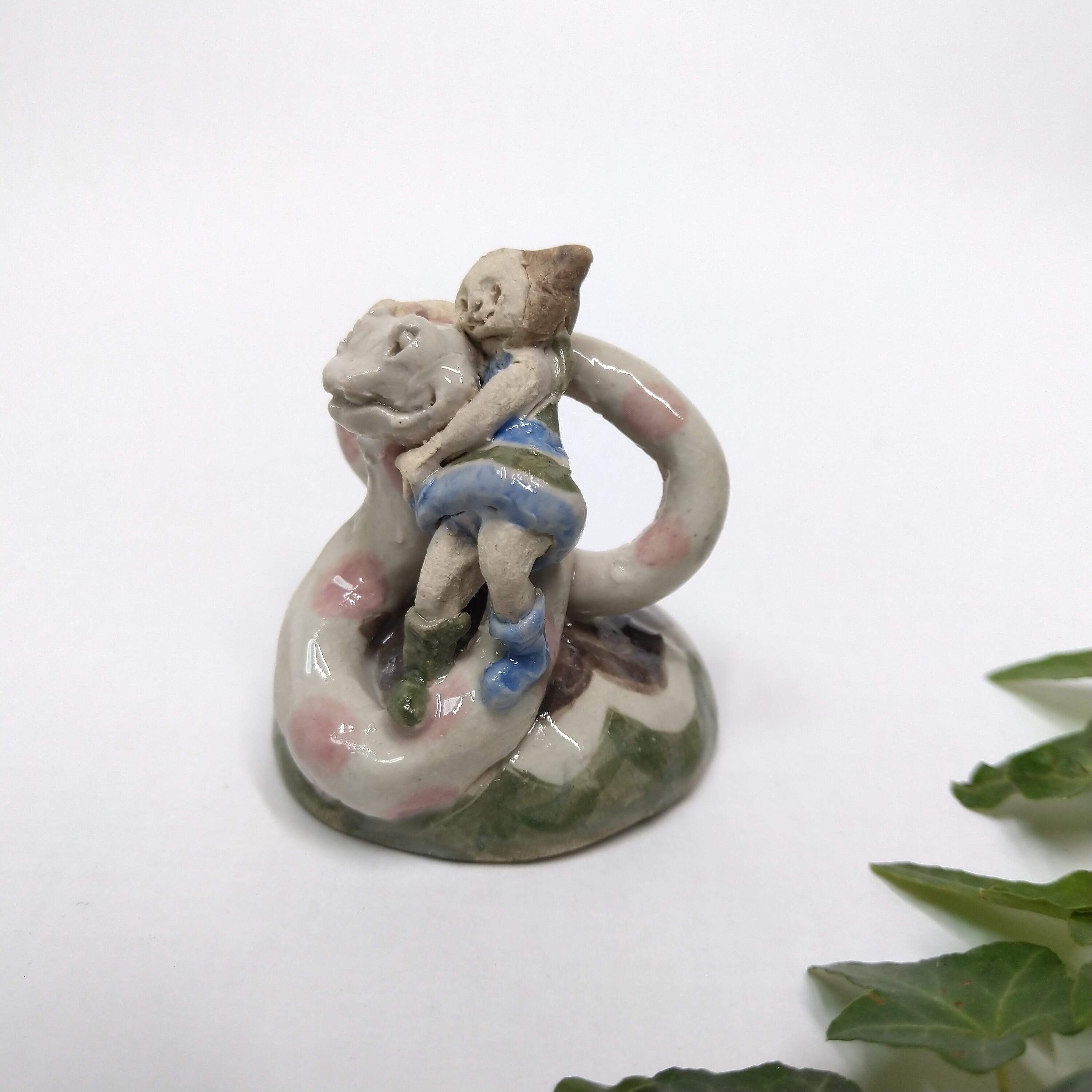 ヘビやちびっこの衣装、土台の一部分にポイントで薄く透明釉をかけているので、その部分は少し光沢があります。