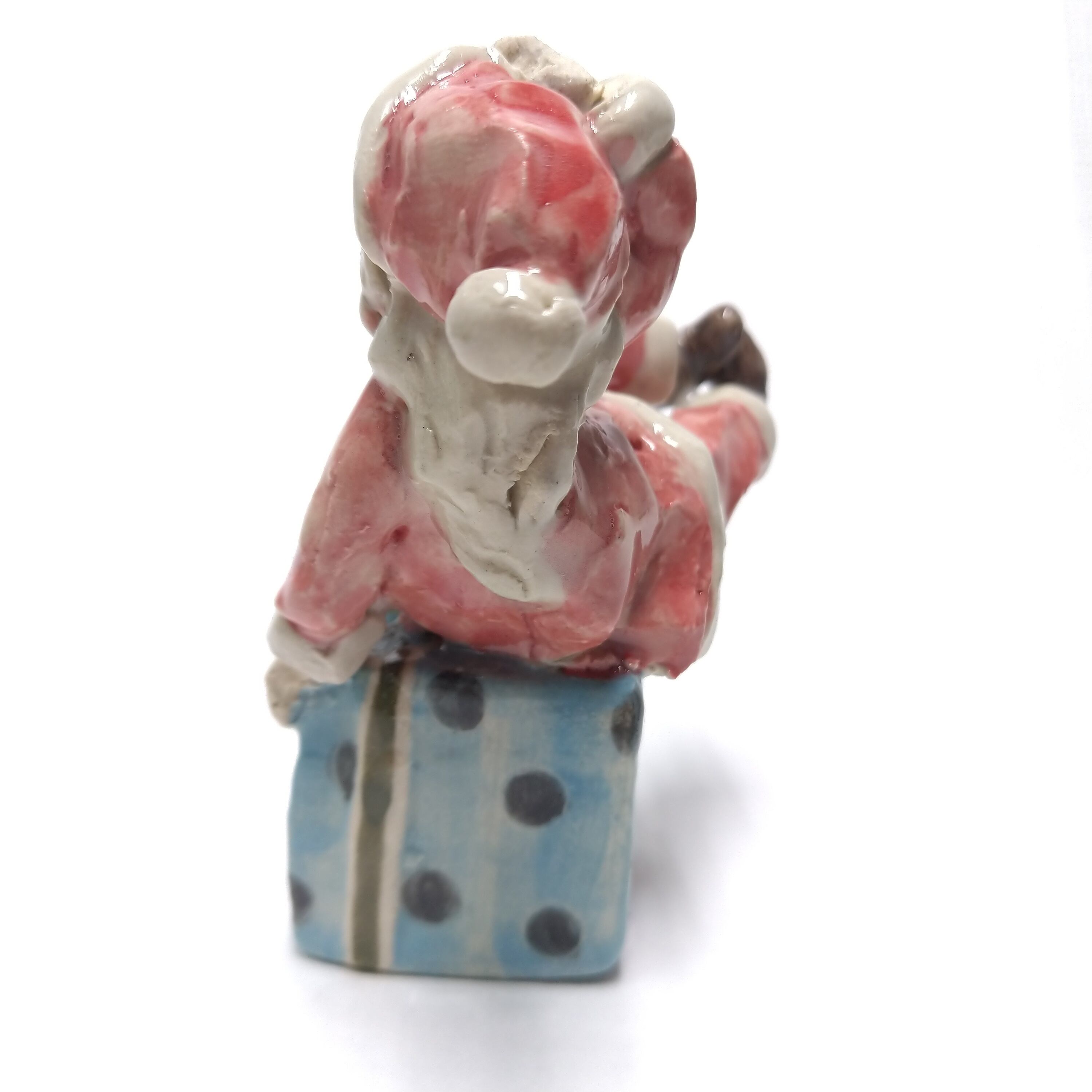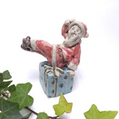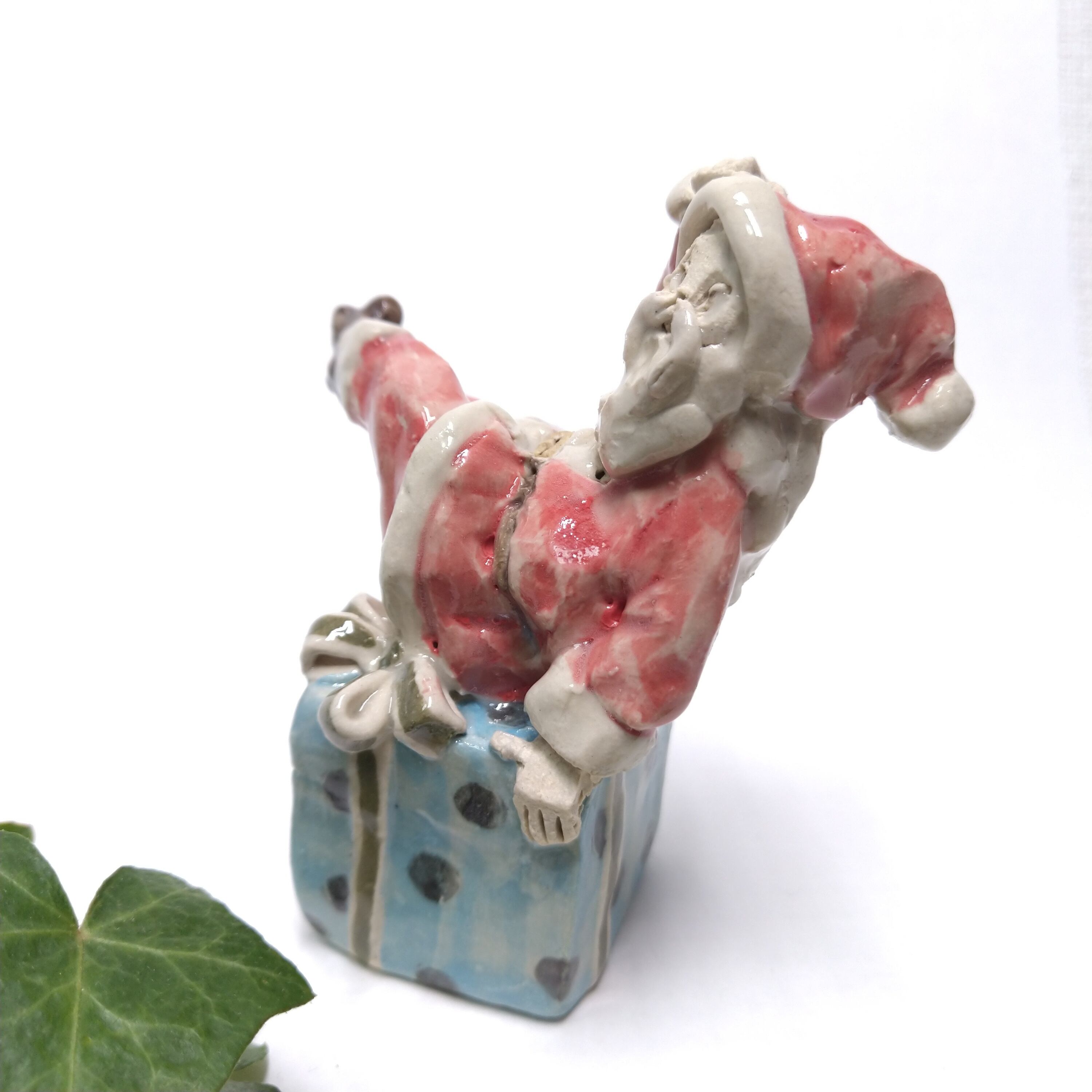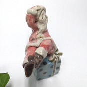 土台のプレゼントの上に陽気なポーズで座るサンタクロースを制作してみました。
