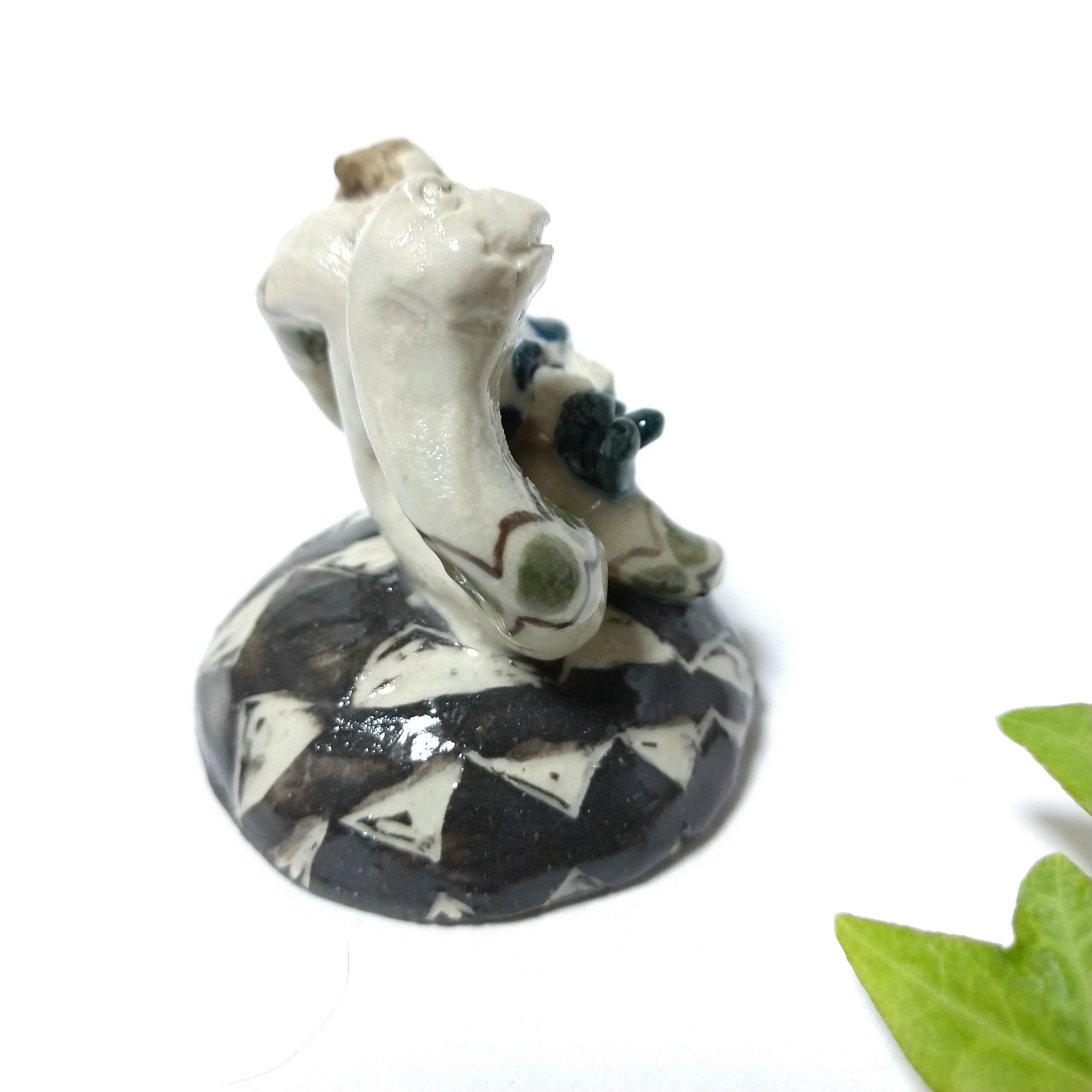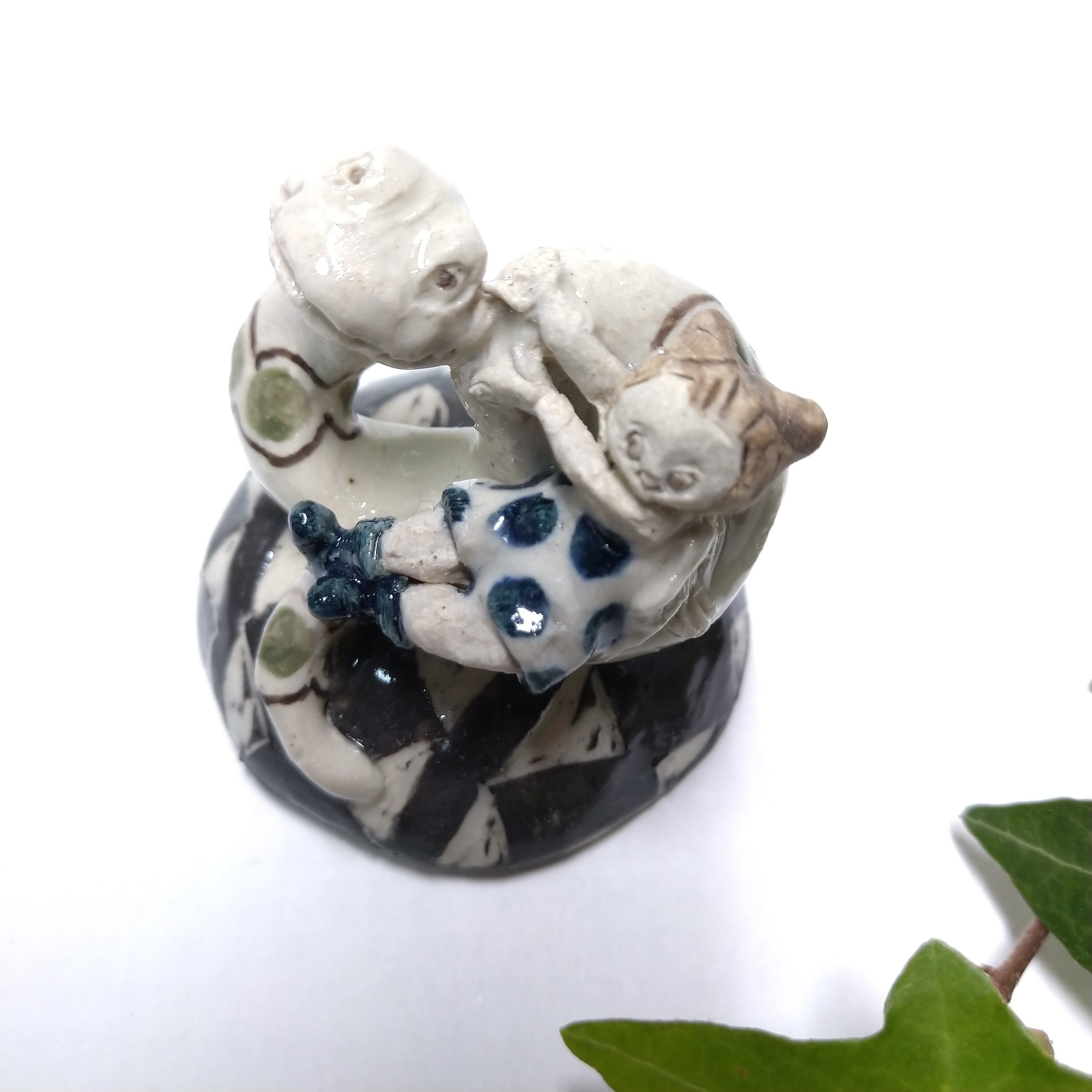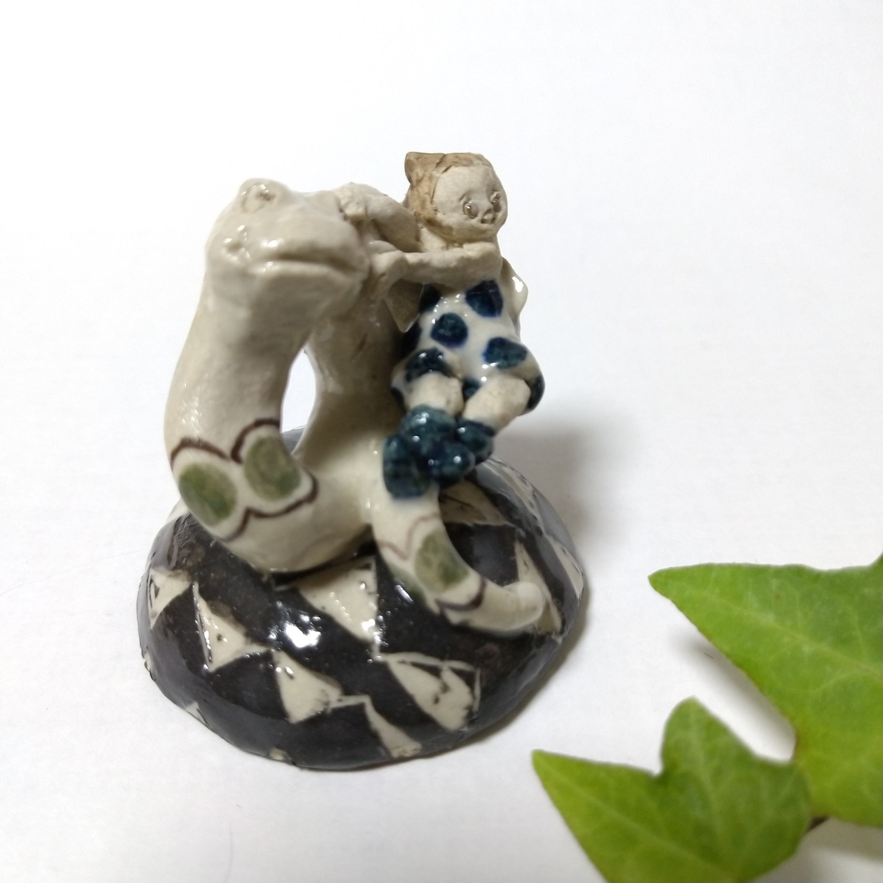 ヘビやちびっこの衣装、土台の一部分にポイントで薄く透明釉をかけているので、その部分は少し光沢があります。