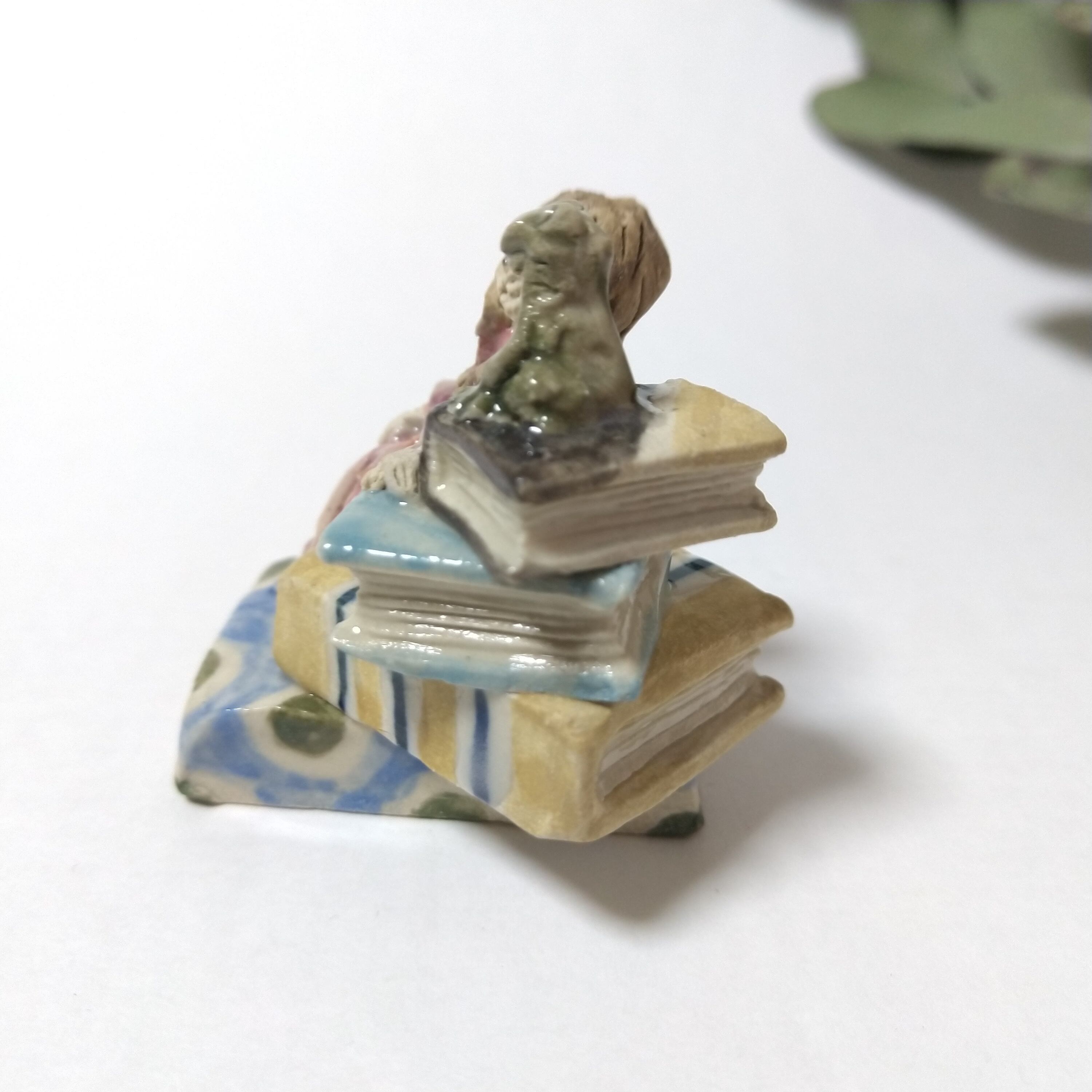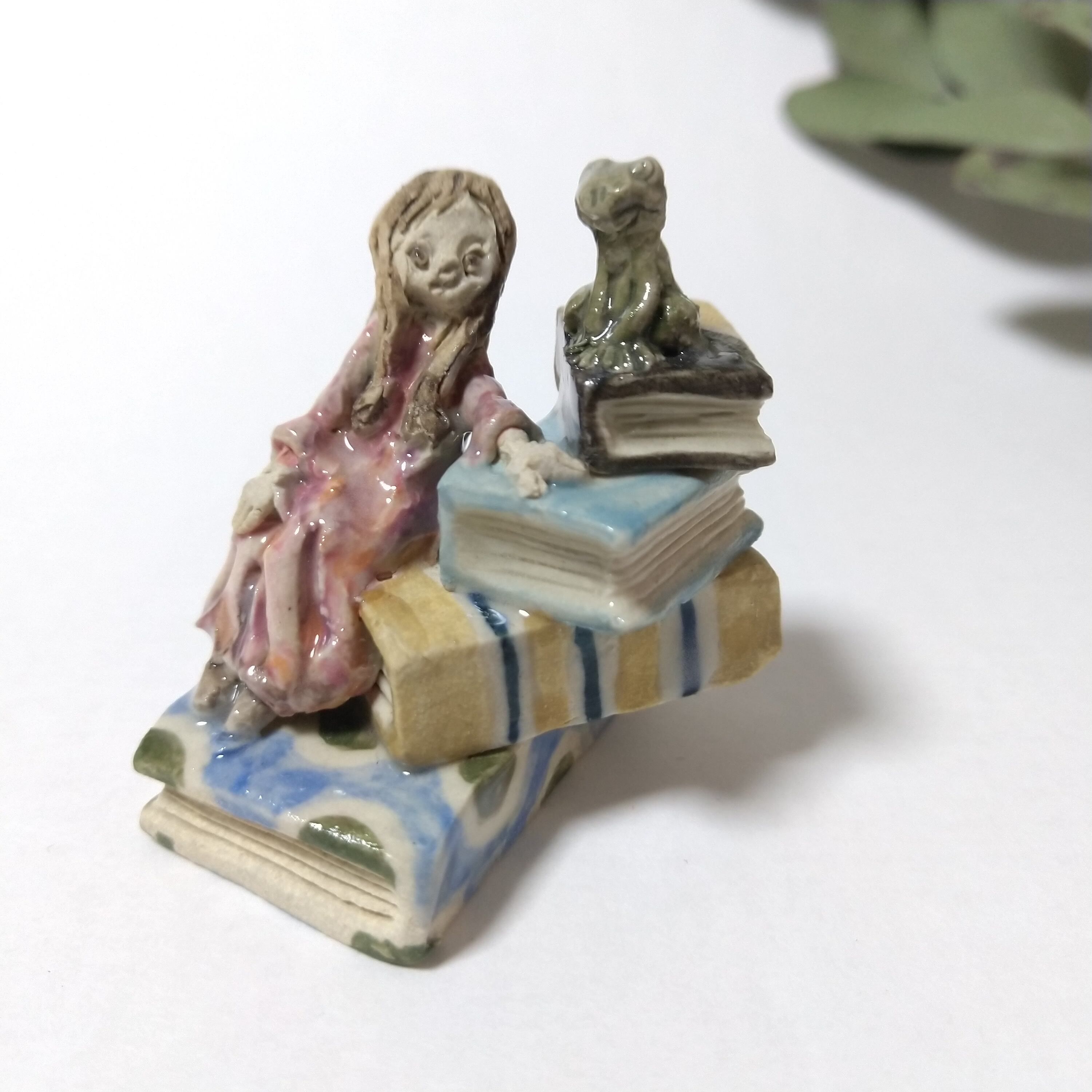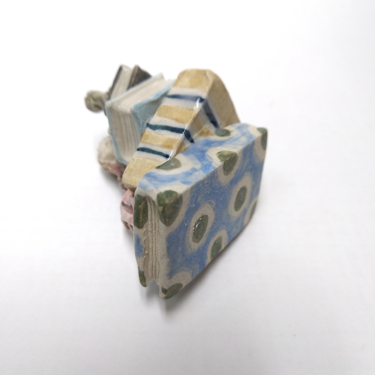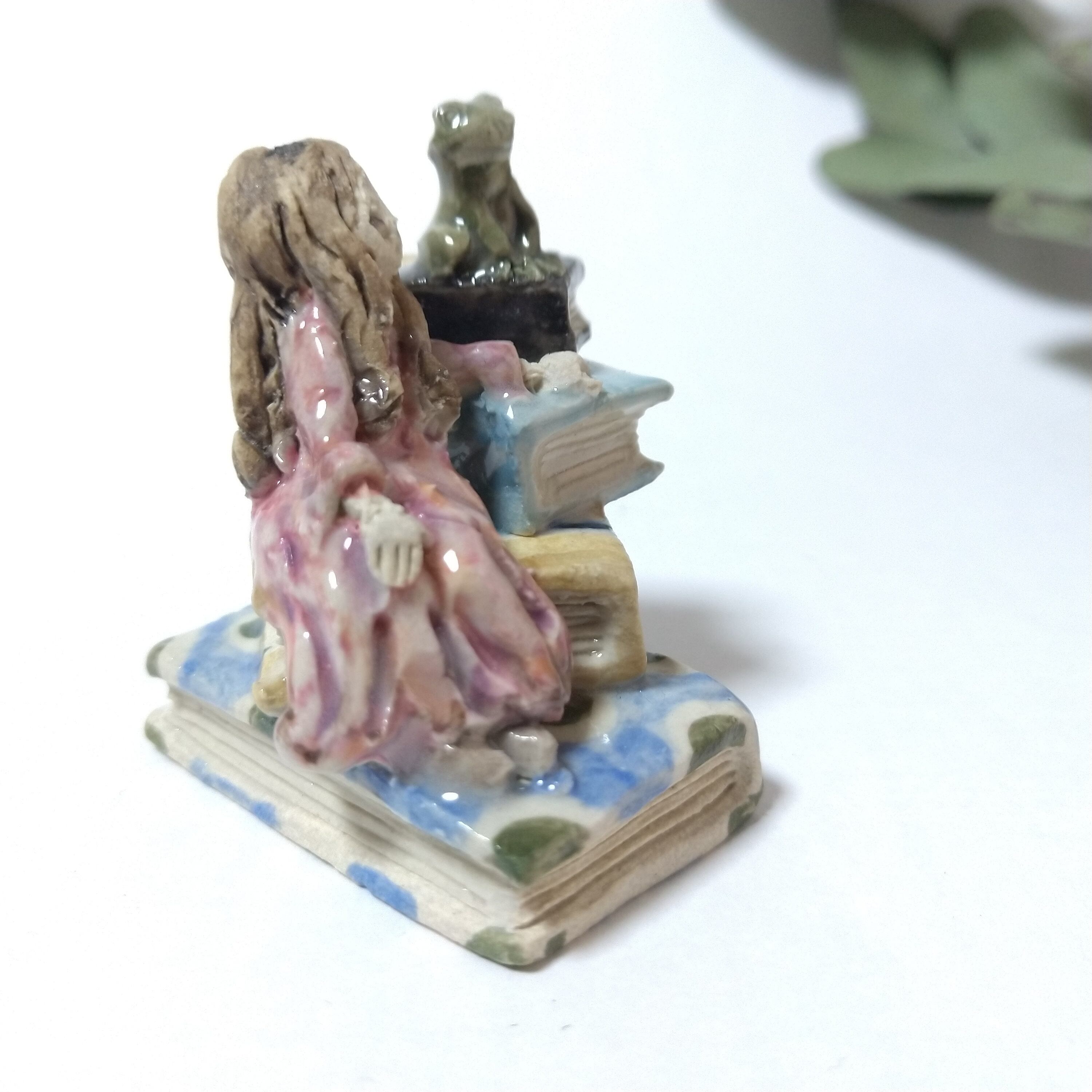 本や衣装の一部に薄く透明釉を施しているので、その部分は少し光沢があります。