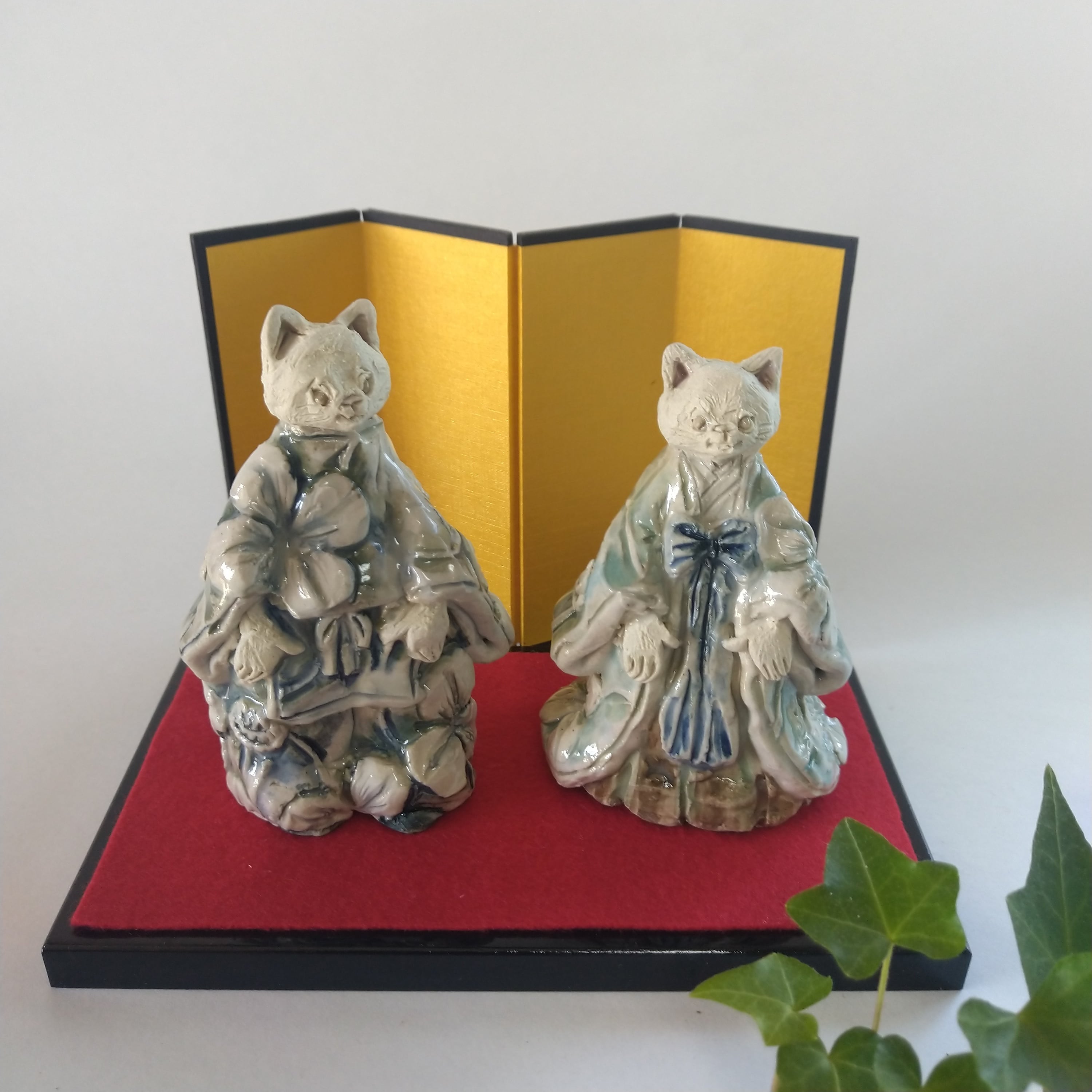 衣装や瞳の一部分にポイントで薄く透明釉をかけているので、その部分は少し光沢があります。