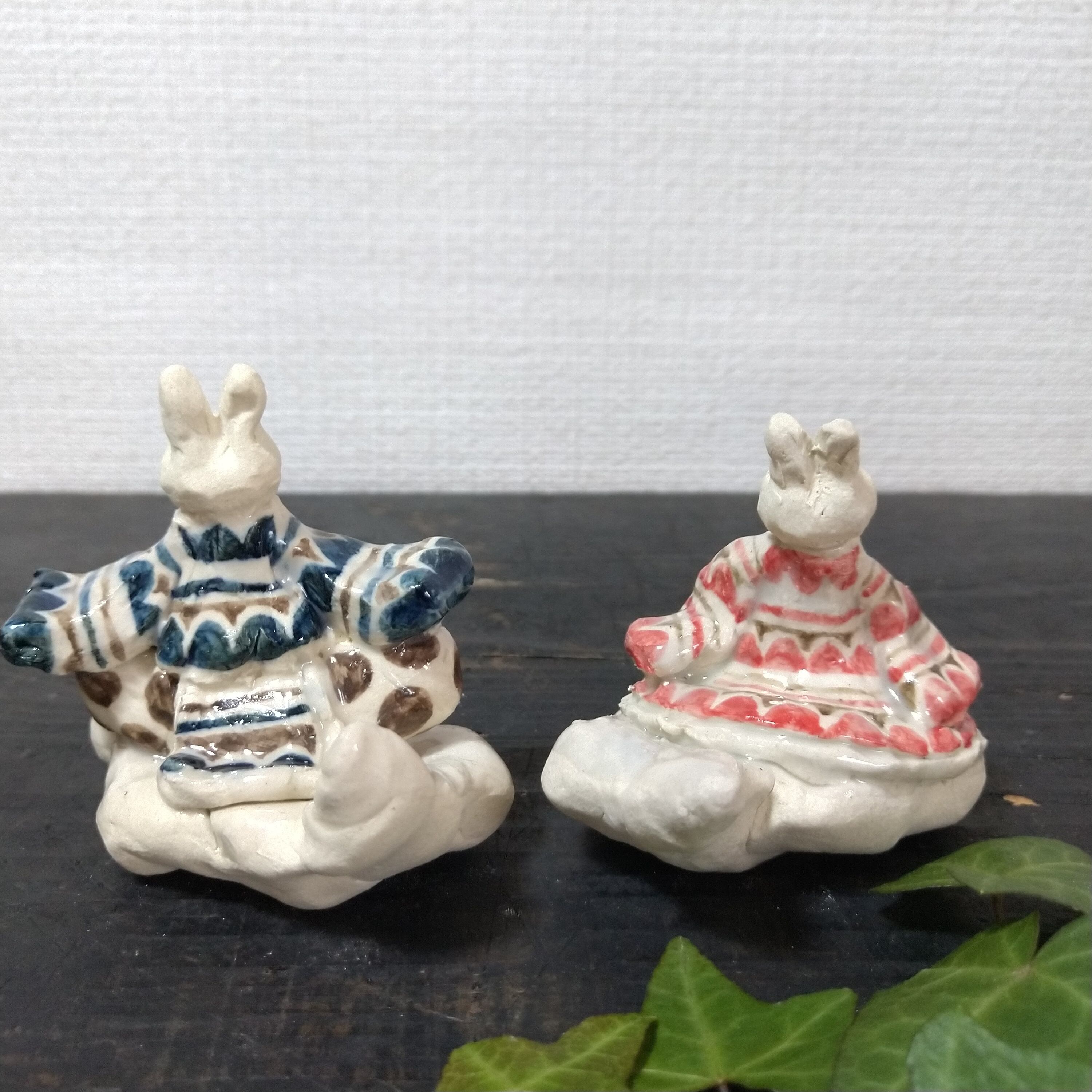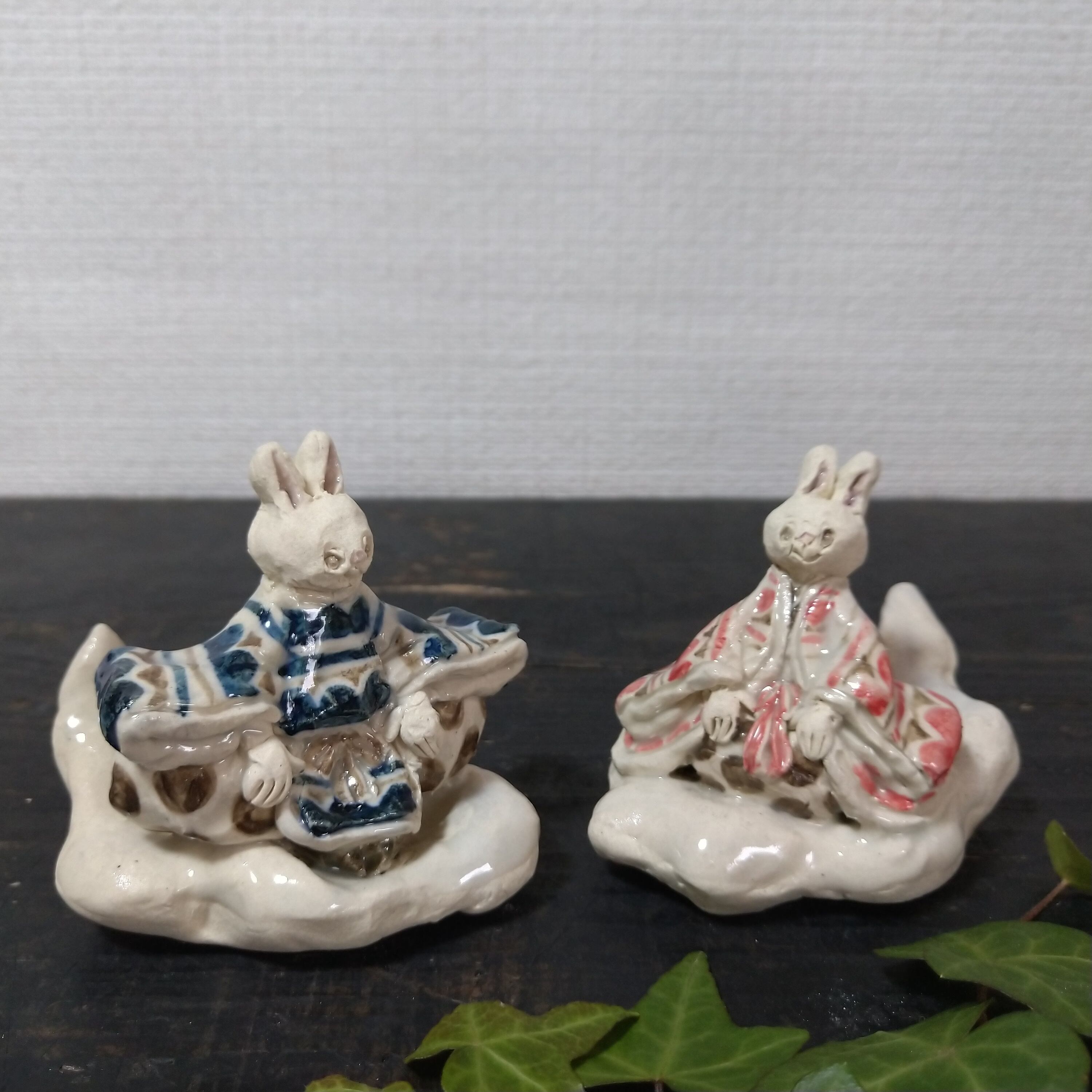 縦横約7.5cm×5cm位の雲型の土台それぞれに、うさぎのお内裏さまとおひなさまを乗せてみました。
